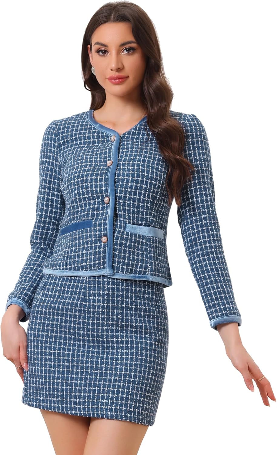 Zweiteilige Outfits: Kariert Tweed Kurzblazer Jacke und Rock Set