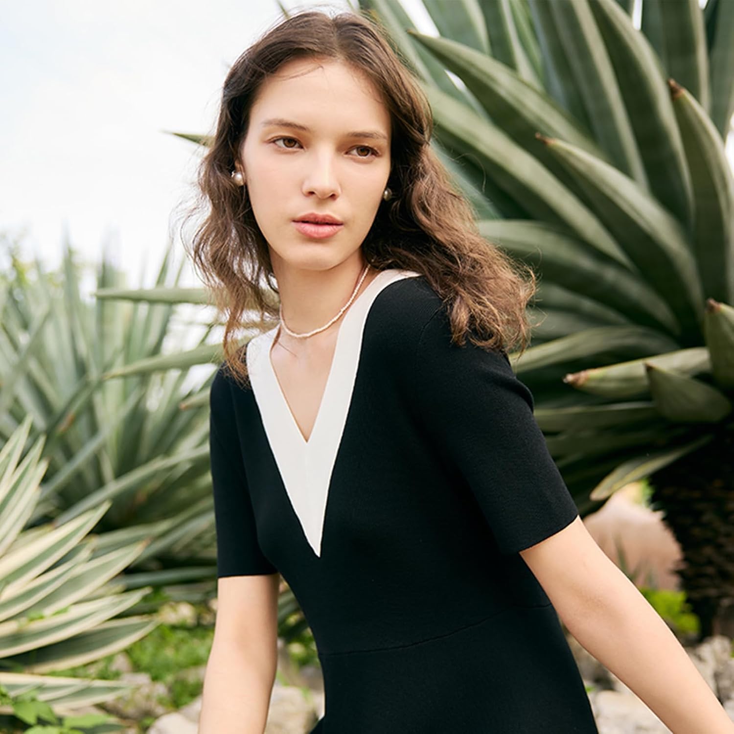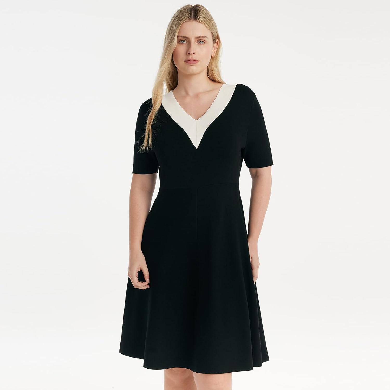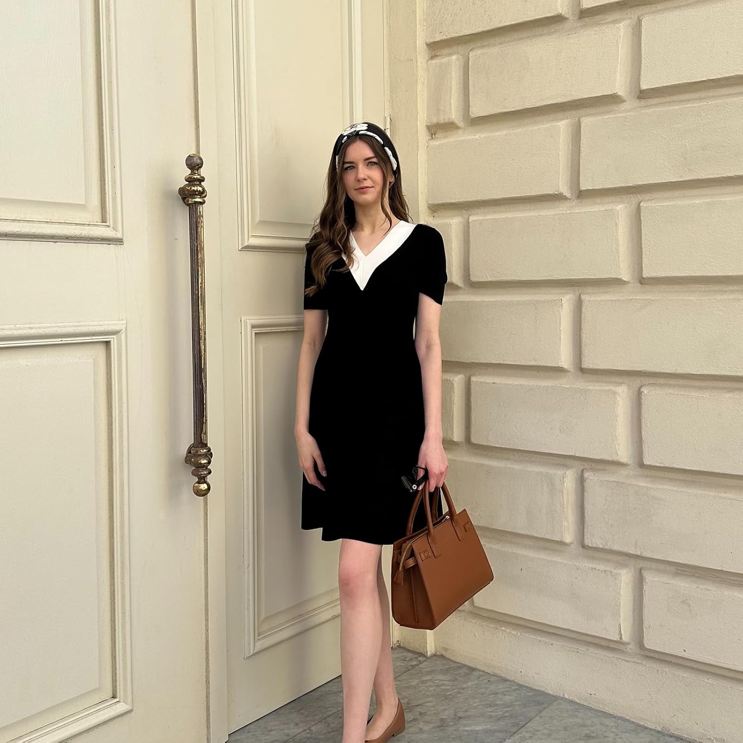 Die A-Linien-Silhouette und das designte hohe Taillenkonzept sind vielseitig und schmeichelhaft für alle Körpertypen. Der Anzugkragen mit Farbblockierung verkörpert einen Vintage-Trend, während die Perlenschnallen dem Kleid einen Hauch von Eleganz verleihen.