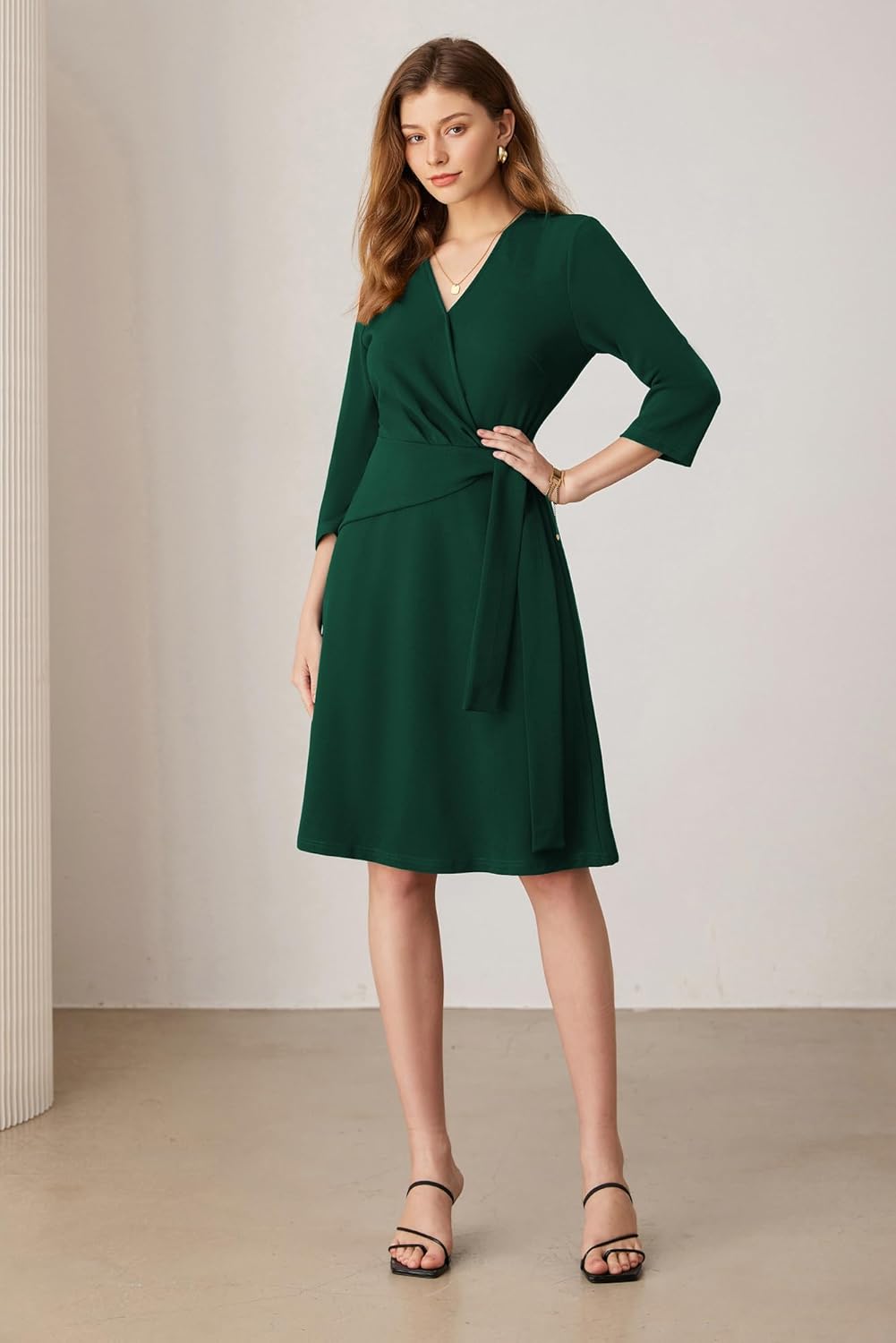 Dieses edle A-Linien-Kleid für Damen verfügt über einen fließenden Faltensaum, lange 3/4-Ärmel und eine schmale Passform. Die elastische hohe Taille und der schlichte, sanfte Farbton in Kombination mit dem Bindegürtel passen zu allen Körpertypen. Der klassische Wickel-V-Ausschnitt und das schwingende, knielange Design verleihen einen Hauch von Raffinesse. Der unsichtbare Reißverschluss auf der Rückseite sorgt nicht nur für eine ansprechende Optik, sondern auch für höchsten Komfort beim An- und Ausziehen.