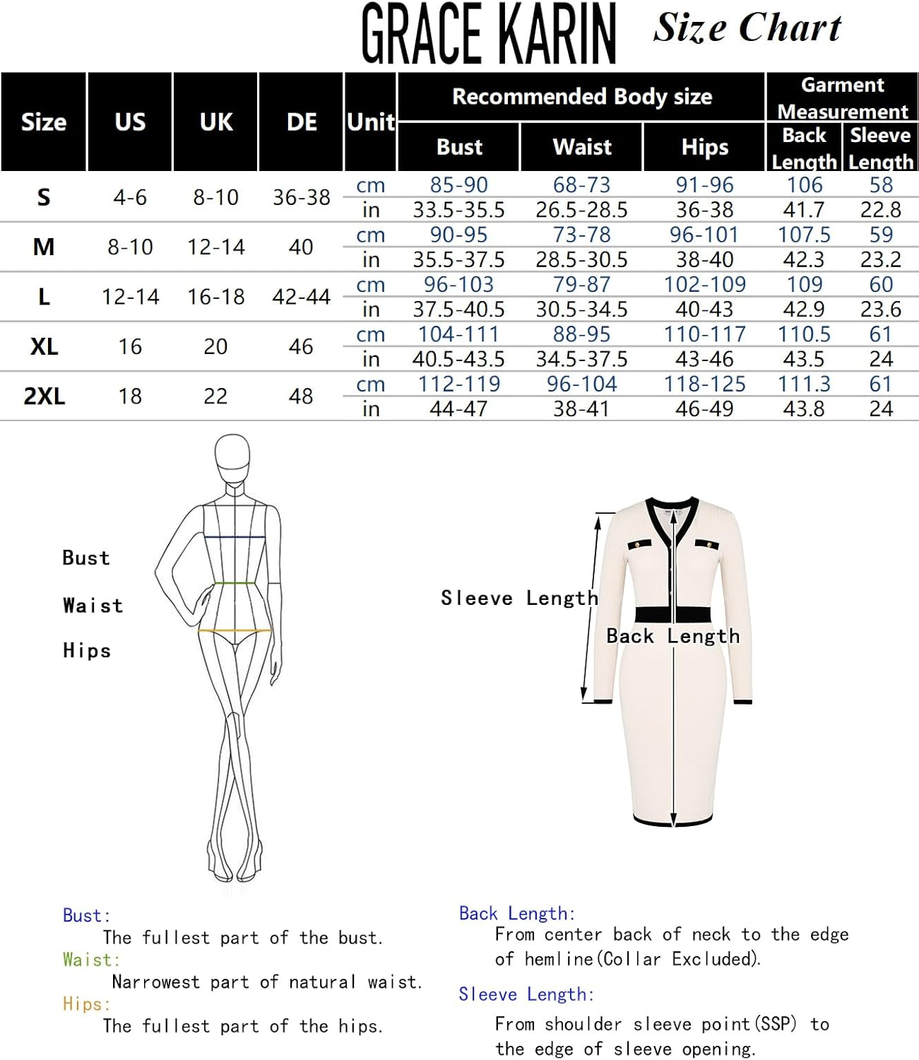 Dieses schwarze Strickkleid von GRACE KARIN ist elegant und hat lange Ärmel sowie einen V-Ausschnitt. Die auffälligen weißen Details an Kragen, Knopfleiste und Taschen verleihen dem Kleid einen modernen, schicken Look. Die figurbetonte Passform schmeichelt der Silhouette. Bei einer Größe von 1,70 m hat das Kleid eine knielange Länge. Ich erhielt das Kleid in ausgezeichnetem Zustand, ohne Mängel. Es lässt sich leicht bügeln und knittert nicht schnell. Der Stoff ist nicht durchsichtig, obwohl mir der Stoff auf dem Internetfoto dichter erschien. Dennoch ist das Material sehr angenehm und ideal für die Herbst- und Wintersaison. Perfekt für formelle Anlässe oder im Büro.