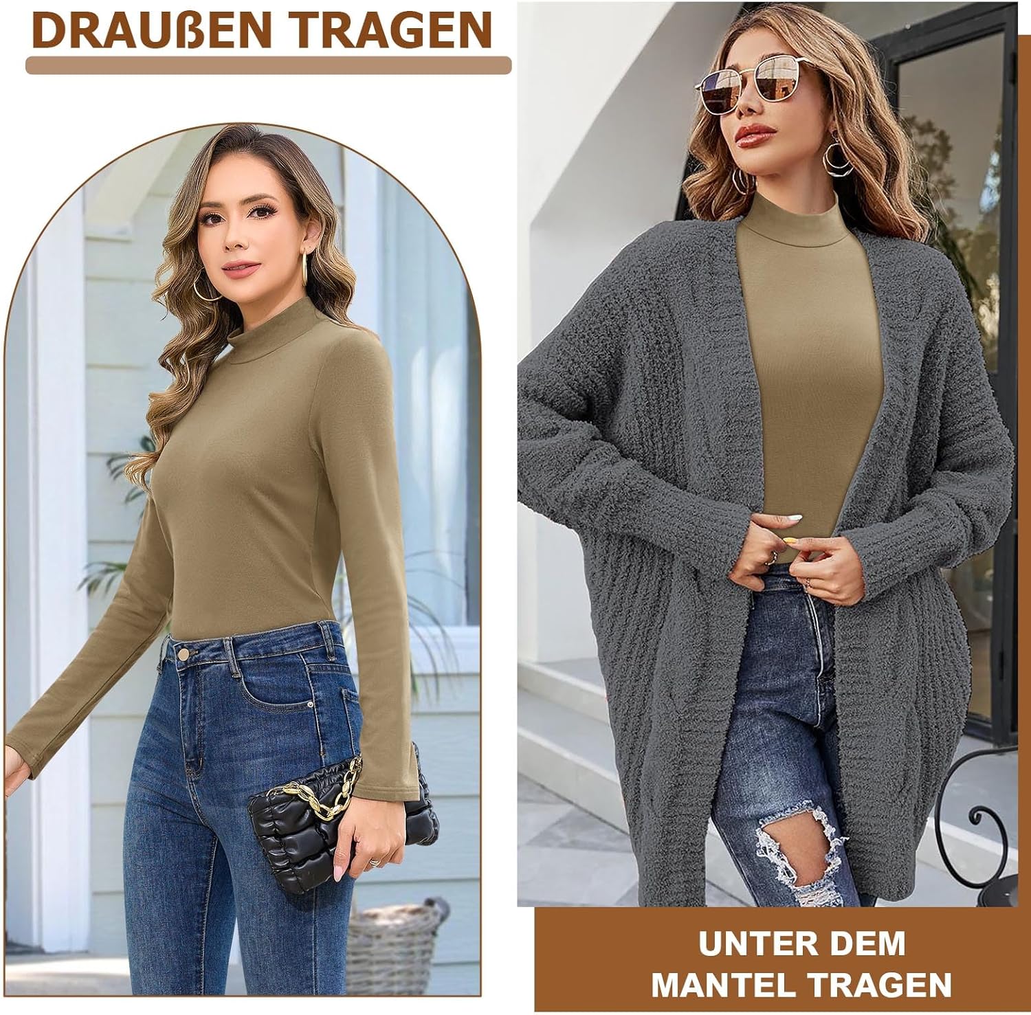 Das Basic Langarmshirt eignet sich ideal für den täglichen Gebrauch. Es kann allein getragen oder mit Jeans, Freizeitkleidung und Leggings kombiniert werden. Zudem lässt es sich hervorragend als Basisschicht unter Pullovern, Strickjacken und Jacken tragen. Es bietet Ihnen optimale Wärme und Komfort, selbst bei extrem kaltem Wetter.