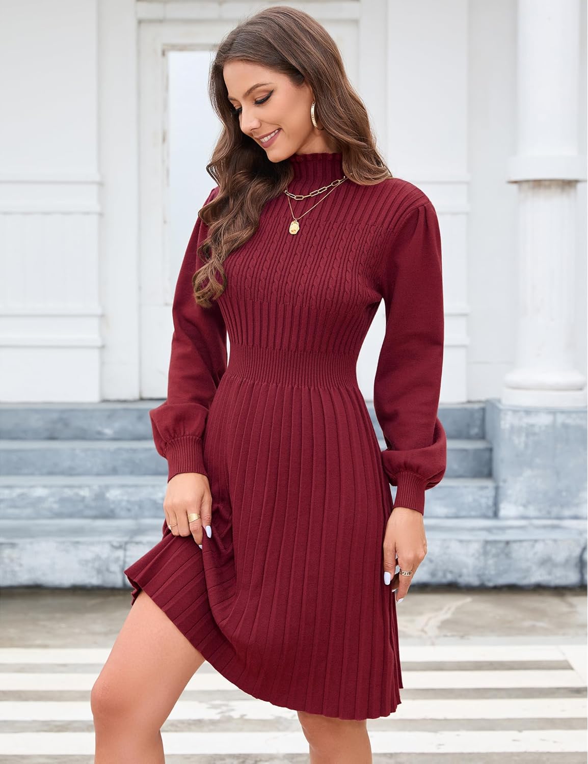 Dieses Pulloverkleid ist pflegeleicht und behält auch nach häufigem Waschen seine Form und Farbe. Ein zeitloses Kleidungsstück, das in Ihrer Herbst- und Wintergarderobe nicht fehlen sollte.