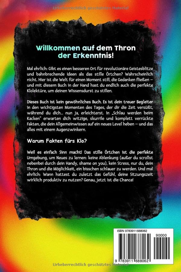 Worauf wartest du noch? Hol dir das Buch, das das stille Örtchen zum Lern- und Lachzentrum macht! Klicke jetzt auf „Jetzt kaufen“ und erlebe, wie viel Spaß es macht, beim Kacken schlau zu werden. Genieße die witzigen und interessanten Fakten und mach jeden Toilettengang zu einem Erlebnis voller Wissen und Humor.