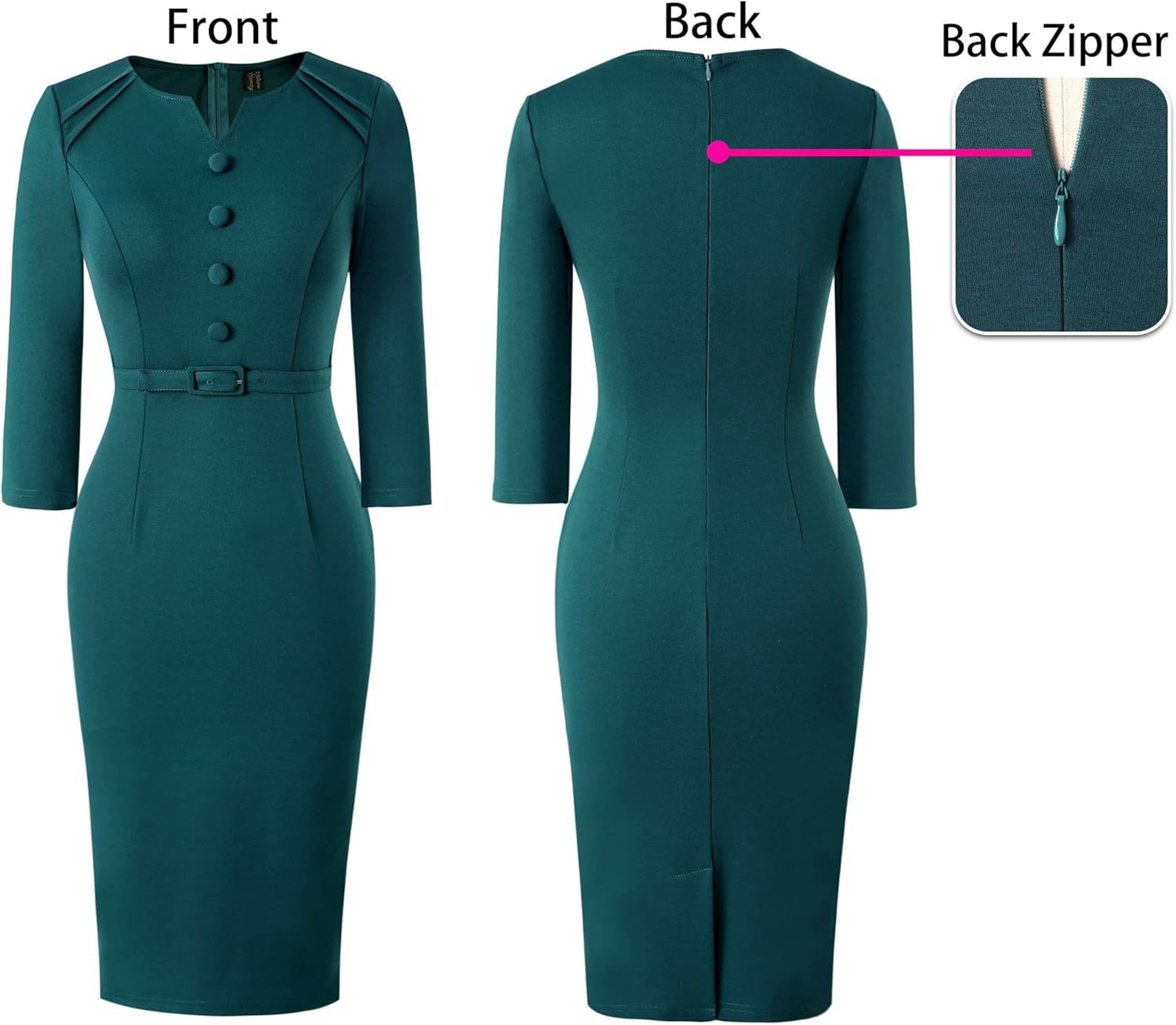 Dieses Kleid sitzt viel besser, als ich erwartet habe. Ich nenne es ein „Mad Men“-Kleid, da der taillierte Stil mich stark an die Kleider der 1960er Jahre erinnert, die in dieser Serie gezeigt werden. Das Kleid ist gut verarbeitet und sehr bequem. Es ist jedoch nicht ganz einfach, den Reißverschluss alleine ganz hoch zu ziehen, also bedenke das. Ich kann meine Arme gut hinter mir bewegen, und es fällt mir trotzdem schwer. Wenn du nicht viel Beweglichkeit hast, wäre es ratsam, jemanden in der Nähe zu haben, der dir beim Reißverschluss hilft. Der integrierte schwarze Gürtel ist süß, aber ich ziehe es vor, ihn mit einem Gürtel in einer helleren Farbe zu kombinieren. Die Knöpfe sehen besser aus, als ich erwartet habe, und ich mag den Ausschnitt wirklich – er ist interessant, ohne übertrieben oder zu dekorativ zu sein.